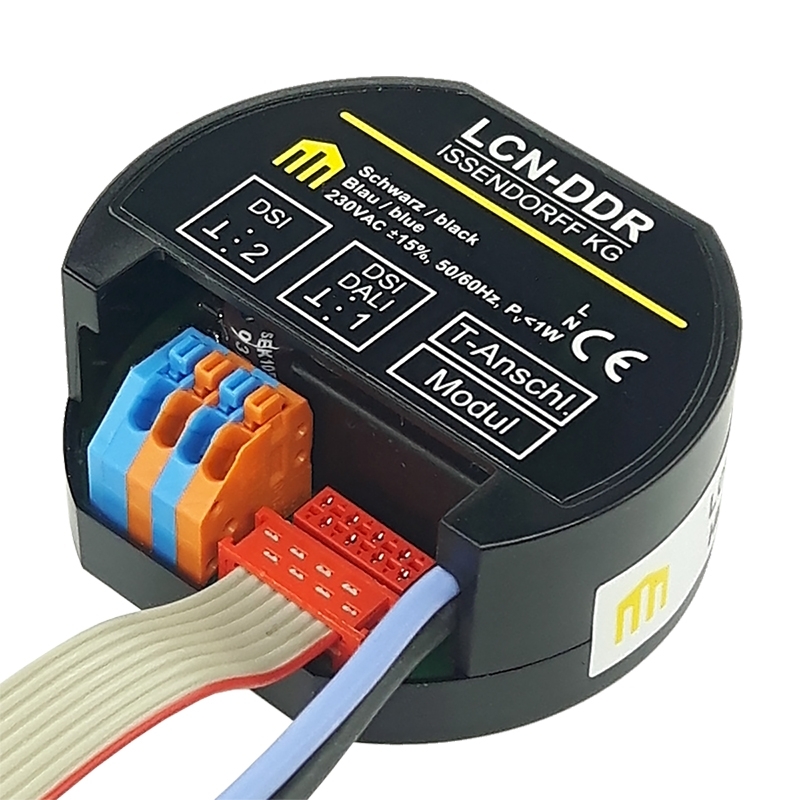Modul LCN-DDR to wysoko rozwiniety interfejs zaprojektowany specjalnie do sterowania cyfrowymi statecznikami (EVG). Umozliwia podlaczenie do zlacza T modulu LCN-UP, przy czym to polaczenie jest wykorzystywane do przesylania dodatkowych urzadzen peryferyjnych.